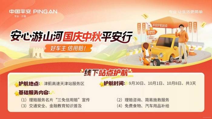双节将至,为持续做好重大节假日客户服务工作,保障市民假期出行安全,平安产险天津分公司于9月26日至10月9日期间,开展以“安心游山河,国庆中秋平安行”为主题的国庆护航活动,打造车险理赔服务名片,切实保障公众在假期期间安全、便捷、畅通出行。